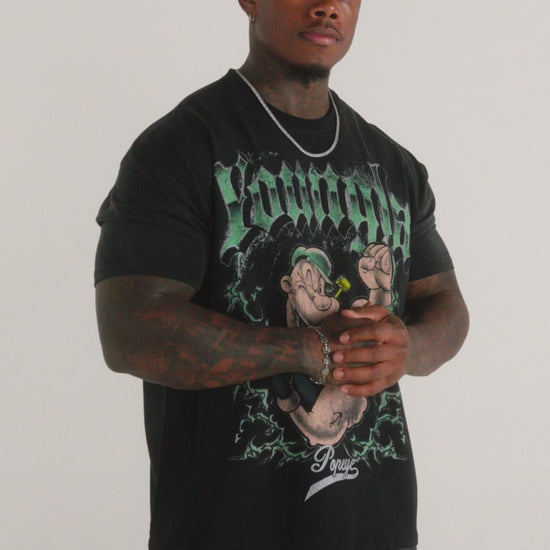 DISEÑO: UN GRÁFICO ICÓNICO Y ATREVIDO DE POPEYE, REALZADO CON UN TOQUE VINTAGE Y ATREVIDO. LOS DETALLES DESGASTADOS Y LAS LETRAS YOUNGLA EXTRAGRANDES LE DAN UN AIRE URBANO Y DESGASTADO.