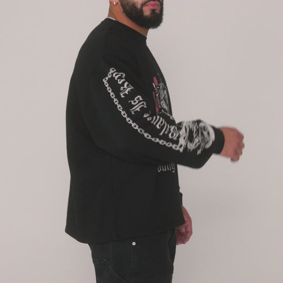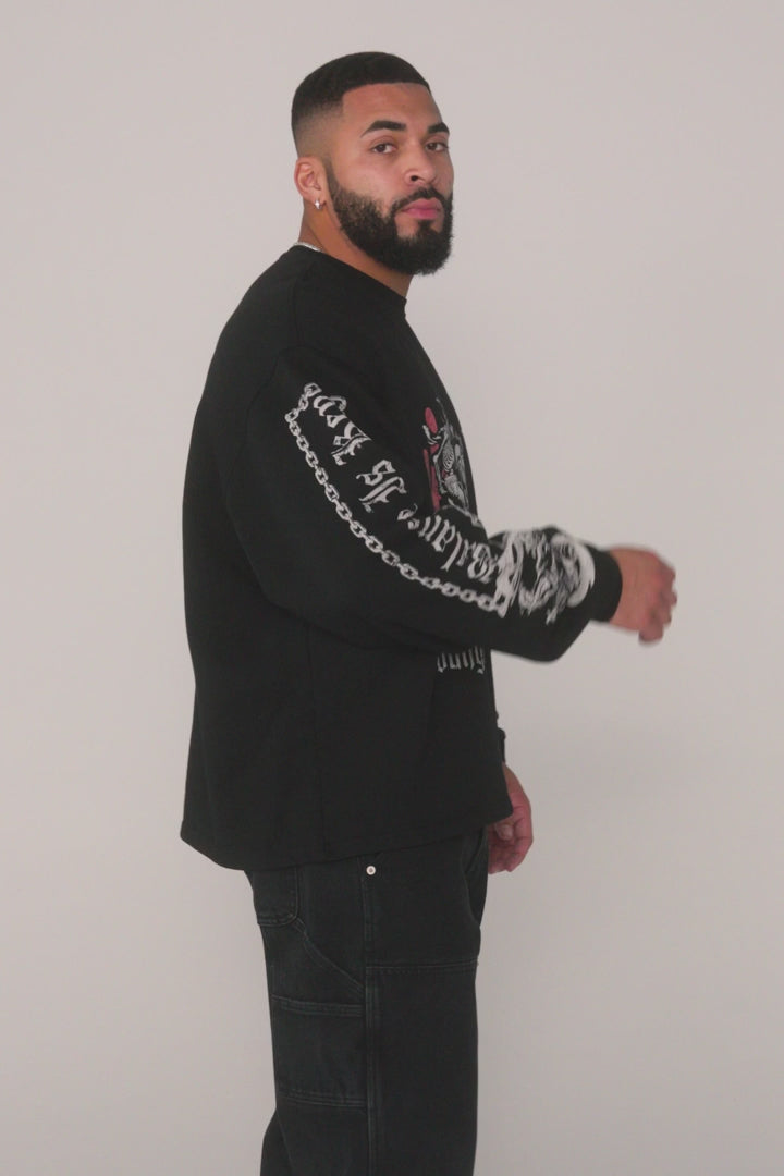 DISEÑO: INSPIRADA EN LA CULTURA DEL RODEO, LA CAMISETA RODEO DE CUELLO REDONDO PRESENTA UN DETALLADO ESTAMPADO DE CALAVERA VAQUERA EN LA PARTE DELANTERA CON GRÁFICOS A JUEGO EN LAS MANGAS. HECHA DE ALGODÓN GRUESO DE 450 G/M² Y CON UN CORTE HOLGADO, ES ELEGANTE Y CÓMODA.