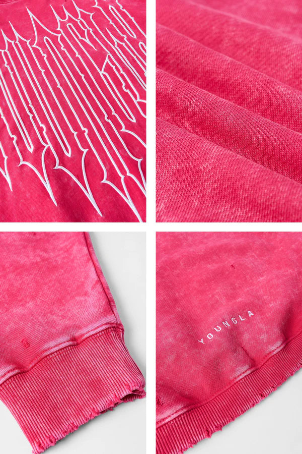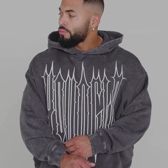 DISEÑO: SUDADERA CON CAPUCHA REVENGE. CONFECCIONADA EN ALGODÓN PREMIUM LAVADO AL ÁCIDO, ESTA SUDADERA PRESENTA EL CONTORNO BORDADO DEL LOGOTIPO DE REVENGE EN LA PARTE DELANTERA, UN DETALLE LLAMATIVO QUE LE DA UN TOQUE DE ESTILO CLÁSICO. LOS CORTES DESGASTADOS EN LOS PUÑOS Y LA CINTURILLA, JUNTO CON UNA CINTURILLA CORTA, LE DAN UN ASPECTO ROBUSTO Y MODERNO.