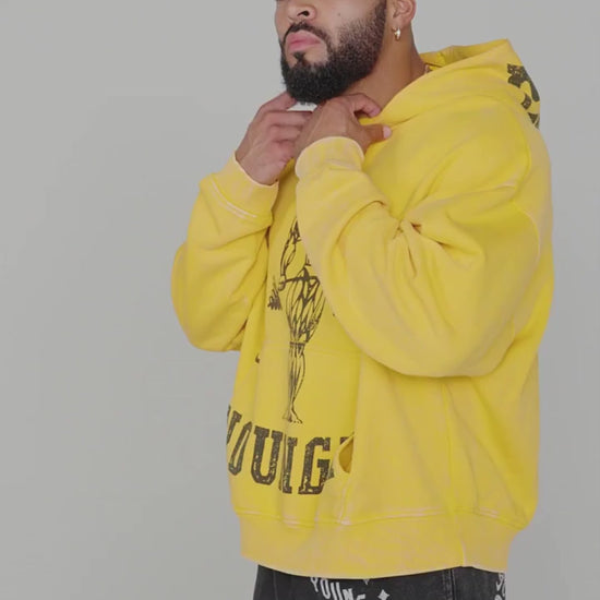 DISEÑO: MARCA TENDENCIA CON LA SUDADERA CON CAPUCHA YOUNGLA X GOLD’S GYM: OVERSIZE PARA MAYOR COMODIDAD Y UN ESTILO IMPACTANTE. LOS GRÁFICOS DESGASTADOS Y EL LIGERO LAVADO ÁCIDO LE DAN UN AUTÉNTICO TOQUE VINTAGE, MIENTRAS QUE LOS CLÁSICOS COLORES AMARILLO Y NEGRO LA HACEN ATEMPORAL.