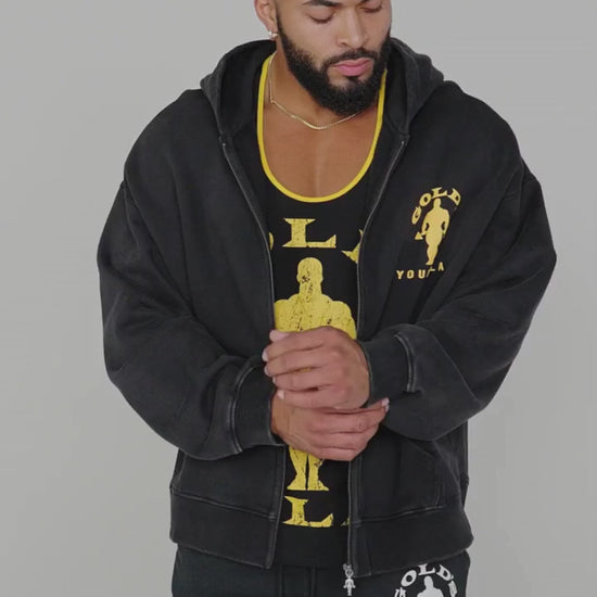 DISEÑO: ESTA SUDADERA CON CAPUCHA Y CIERRE DE CREMALLERA DE GOLD’S GYM X YOUNGLA OFRECE UNA COMBINACIÓN PERFECTA DE COMODIDAD Y ESTILO ICÓNICO. CON UN AJUSTE HOLGADO Y HOLGADO Y UN LLAMATIVO ESTAMPADO ABULLONADO EN LA ESPALDA, ESTÁ CONFECCIONADA CON TELA LAVADA PARA DARLE UN AIRE VINTAGE. PÓNTELA PARA LOGRAR UN ESTILO INFORMAL QUE SE DESTAQUE EN CUALQUIER ENTORNO.